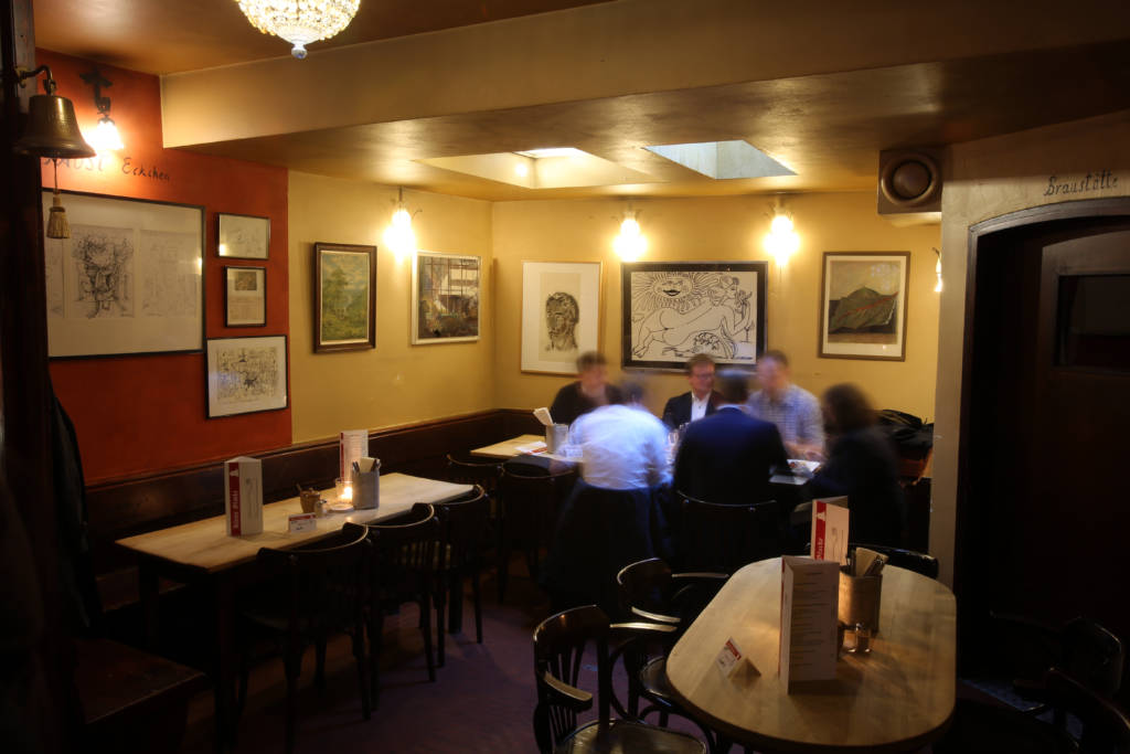 - (Flönz gebraten, Schmorzwiebeln, Stampfkartoffeln und Apfelkompott untereinander)
